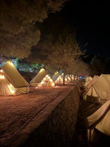 Para los más aventureros, el camping ofrece más de 40 parcelas amplias y sombreadas, ideales para tiendas de campaña, caravanas o campers. Muchas de ellas permiten aparcar el coche junto al alojamiento, y todas ofrecen vistas inmejorables a las montañas que rodean el camping.